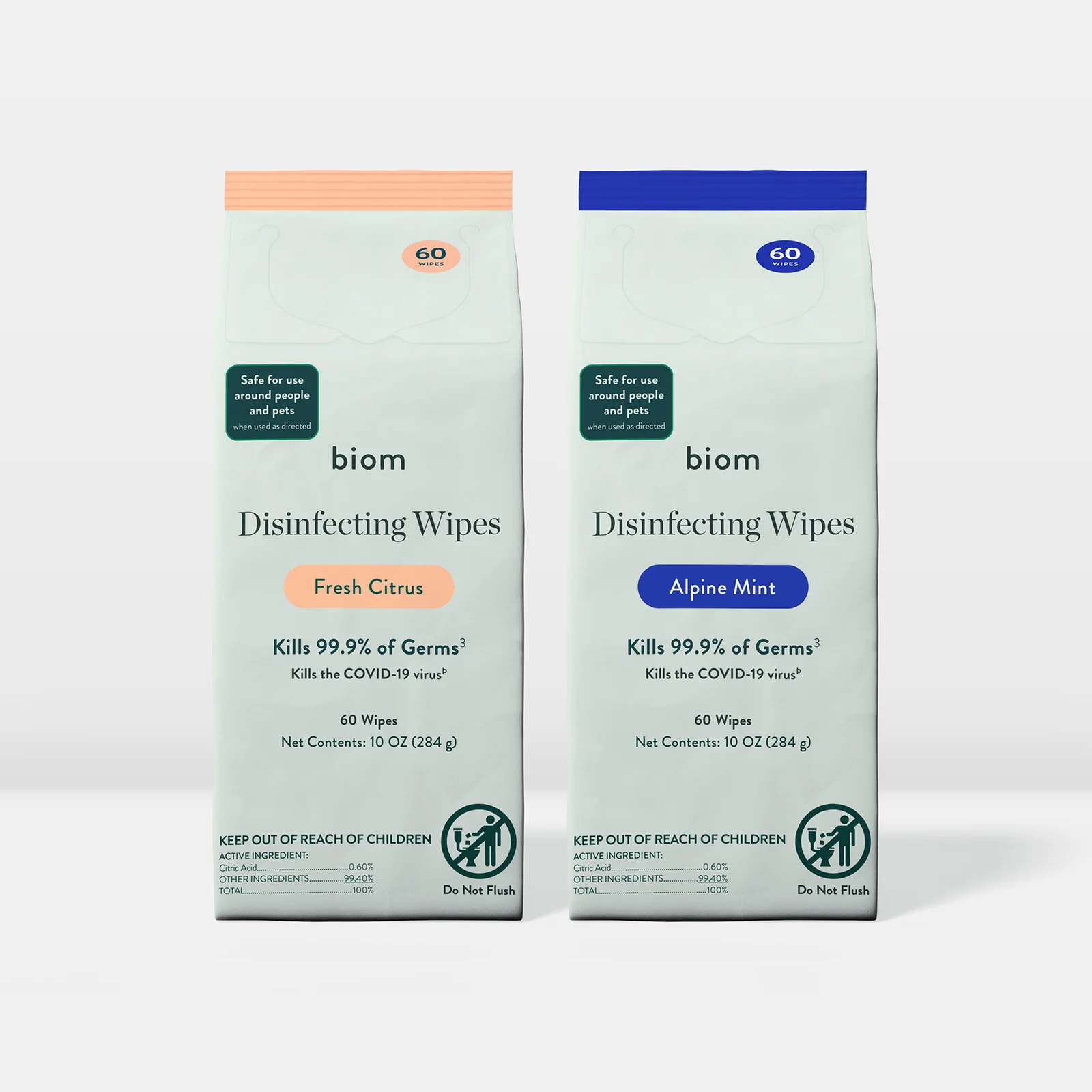 Biom: Biom's Disinfecting Wipes come in two varieties – a clean, citrus-forward scent and a fresh alpine mint scent. They’re not bleach-y and won’t burn your eyes. They leave no sticky residue, just a pleasant, minty or citrus-y scent. For everyday use around food prep areas, kids, and pets, the experience is noticeably different from conventional wipes.