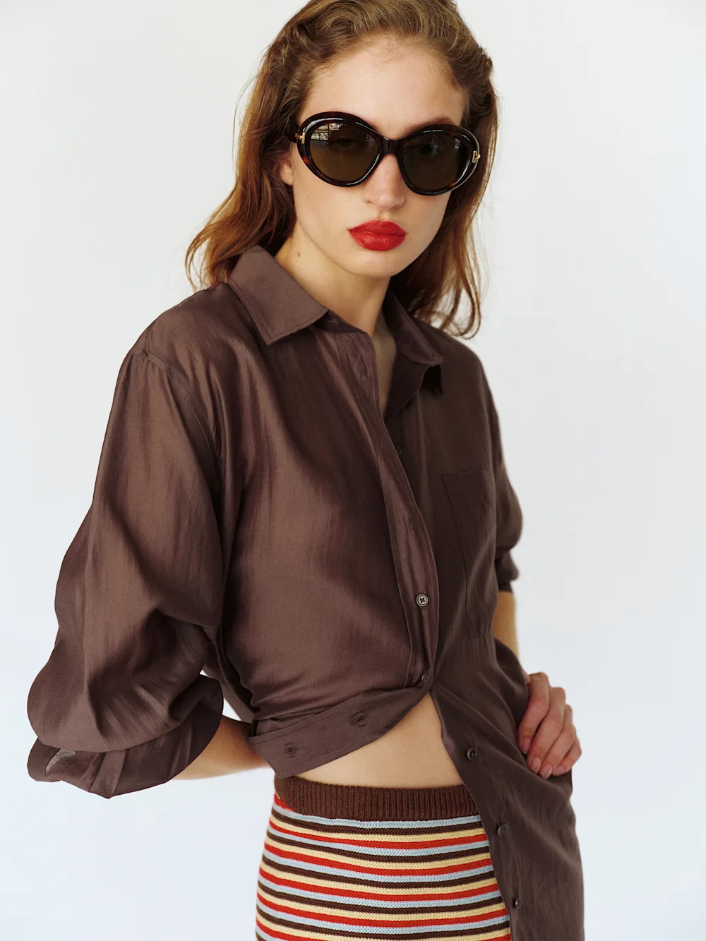 As always, Euphoria is full of great vintage finds. Lexi (Maude Apatow)’s buttoned-up style has always had a retro-chic streak, so it makes sense that she’d be wearing this vintage Nik Nik Brown Button Up ($200). Fun fact: ‘70s maximalist icons Nik-Nik were responsible for some of John Travolta’s disco looks in Saturday Night Fever. Their shirts are pretty easy to find secondhand on eBay and Etsy, but if you’re looking for something a little more contemporary, the Reformation Eli Oversized Shirt in Sheer Brown ($148) has a more subtle collar that doesn’t immediately scream “disco fever.” Another essential in Lexi’s working girl wardrobe: a great hairclaw. We can attest firsthand to the need for one of these on set. The Kitsch Large Tort Flat Cloud Clip ($7) is perfect for a rushed messy bun on the way to work, plus its flat profile makes it easier to wear in mat classes or in bed.