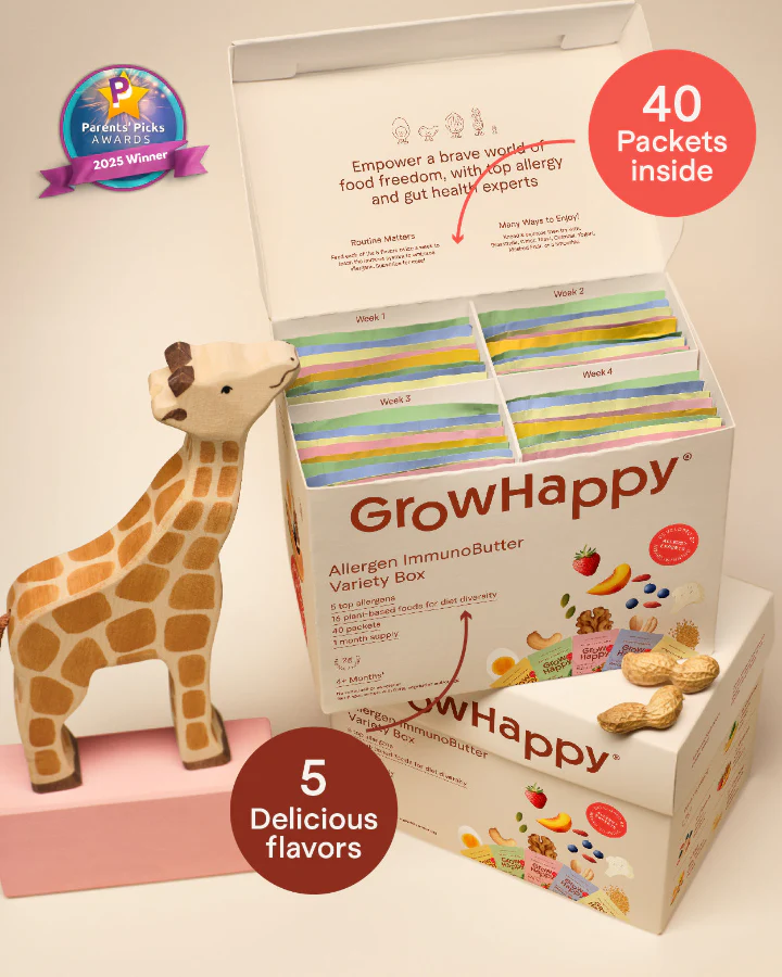 That’s where GrowHappy comes in. Their Allergen ImmunoButters provides evidence-based servings of nut and seed butter mixes, each featuring one of five top allergens that are especially important: peanut, egg, cashew, walnut, and sesame. It’s an easy way to keep these important allergens in your baby’s diet without having to plan it all yourself (mom hack: sign up for their 3-month training program to help set a strong foundation and build tolerance).
