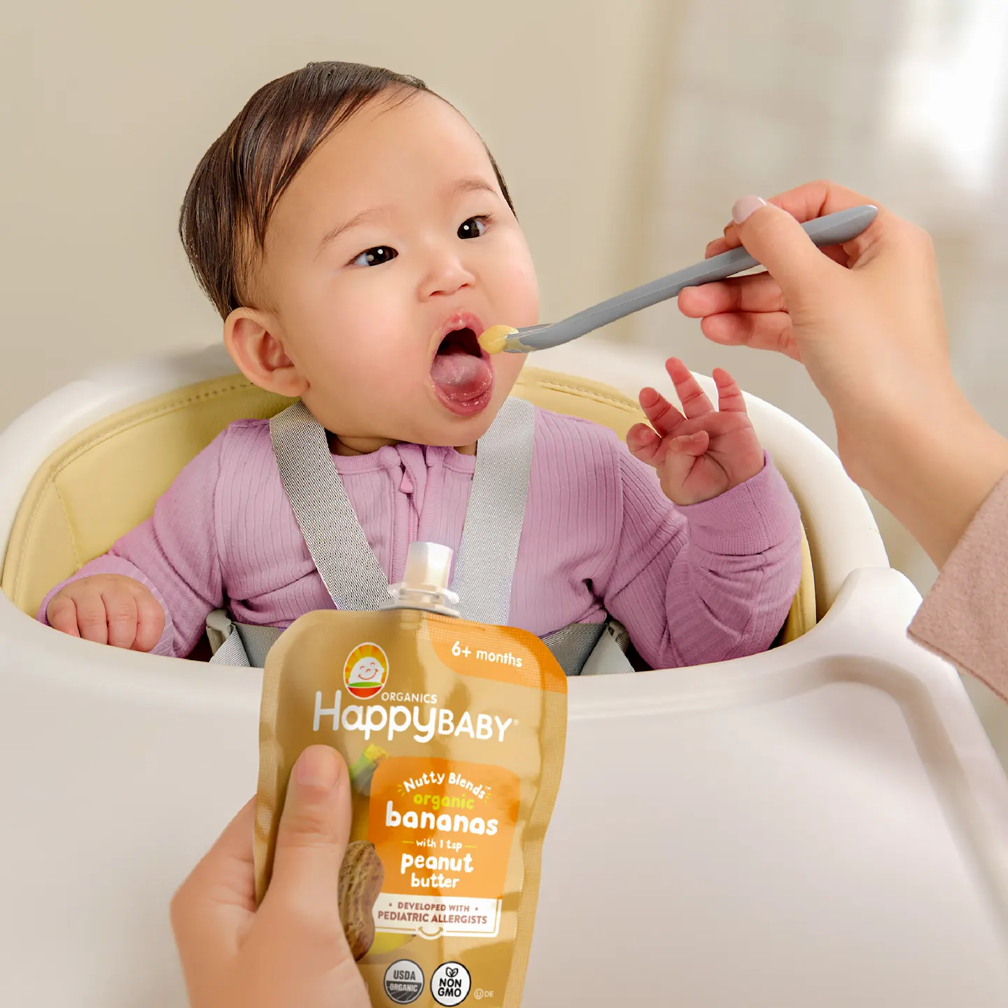 That’s where Happy Baby Organics Nutty Blends come in. These baby pouches are creamy, delicious purees that combine peanuts and tree nuts with familiar fruits, making it a convenient, tasty way to introduce and keep allergens in your baby’s diet. Here’s what you need to know about allergen introduction and how Nutty Blends helps make it easier for you and your baby.